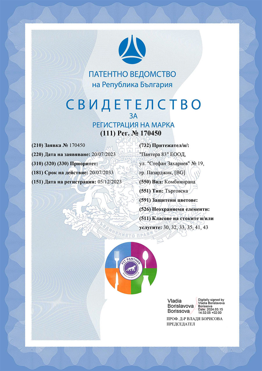 Избрахме името на Fit Panther. То произлиза от силата на животното Пантера – силно и мистично, както за хората, така и за животните. Ние харесваме силата му и затова решихме да наречем нашата здравословна кухня с основно име “Пантера/Panther”. Но, за да е по-разпознаваемо в здравословните и спортни среди, сложихме и “Фит/Fit” – и така стана “Fit Panther”®️ с основно мото: „Подобри качеството си на живот с Fit Panther®️”. По този начин името ни вече е търговска марка.